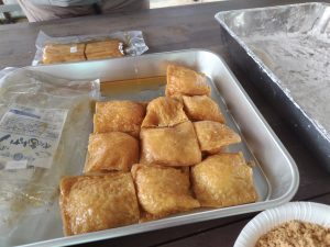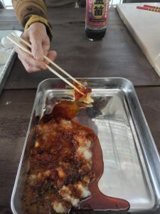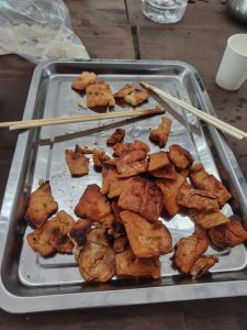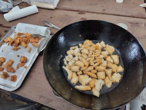 なので、お米を蒸している間は、Sさんからいただいたお餅をあらかじめスライスして干しておいたものを持ってきたので、それを焼いたり、揚げたり・・・。