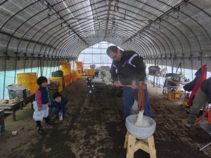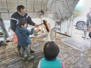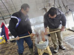 大人たちは、作業終了後、収穫もバッチリして、お楽しみの餅つき大会が始まりました。